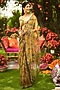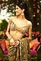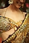 Mahima Mahajan presents a gold pre-draped saree in organza base with hand embroidery. It is paired with an off-shoulder blouse. Accentuate it with statement earrings and heels, perfect for a wedding reception, festive soiree or cocktail event.