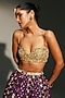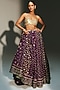 Mahima Mahajan presents a grapevine lehenga crafted in banarasi silk chanderi base with a dragonfly logo on the waist belt and hand embroidery. It is paired with a golden embroidered bralette and a silk organza dupatta. Style it with striking emeralds or heirloom polki, a handcrafted potli, and elegant heels to complete the quintessential bridal moment.