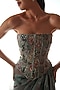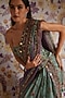 Featuring a green corset top in silk organza base with print and hand embroidery. It is paired with a draped skirt and a dupatta. Accentuate it with zircon dangler earrings, metallic heels and a polti bag for a festive occasion, sangeet or destination wedding.