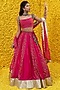 Featuring a hot pink lehenga in banarasi chanderi base with embroidery. It is paired with a matching cowl neck blouse and an organza dupatta having tassels.
