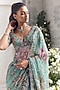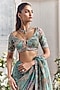 Mahima Mahajan presents a jade green pre-draped saree in silk organza base with print and embroidery. It is paired with a hand embroidered blouse. Step into celebration mode with block heels and polki earrings for weddings or mehendi ceremonies.