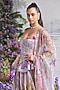 Mahima Mahajan presents a lilac lehenga in silk organza base with floral print. It is paired with a hand embroidered peplum corset and an embroidered dupatta. Turn heads in block heels and polki earrings that magnify your lehenga set, perfect for weddings or sangeet ceremonies.