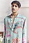 Featuring a jade green kurta in linen satin base with print. It is paired with trousers having pintucks detail. Elevate the look with minimal accessories and classic mojaris for mehendi ceremonies, radiating regal grandeur.