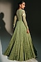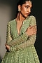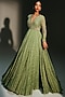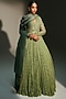 Mahima Mahajan presents a pista green anarkali crafted in banarasi silk chanderi base with hand embroidery. It is paired with a silk organza embroidered dupatta. Style it with emerald earrings, layered bangles, and block heels, perfect for weddings, sangeet, and engagement celebrations.