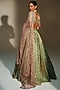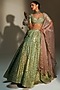 Mahima Mahajan presents a pista green kalidar lehenga crafted in banarasi silk chanderi base with a dragonfly logo on the waist belt and hand embroidery. It is paired with an embroidered blouse and a blush pink silk organza dupatta. Accentuate the look with emerald or polki jewellery, a potli bag and heels for a wedding, sangeet or engagement ceremonies.