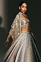 Mahima Mahajan presents a platinum lehenga crafted in banarasi chanderi base with a dragonfly logo on the waist belt and hand embroidery. It is paired with an embroidered blouse having criss-cross detail at the back and a metallic dupatta. Accentuate the look with emerald or polki jewellery, a potli bag and heels for a wedding, sangeet or engagement ceremonies.
