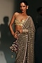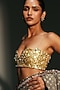 Mahima Mahajan presents a platinum pre-draped saree crafted in banarasi silk chanderi and banarasi georgette base with hand embroidery. It is paired with a golden embroidered bralette. Accentuate the look with chunky earring, an embellished potli bag and block heels for a perfect a festive gatherings, wedding functions, cocktails, or cultural celebrations.