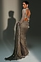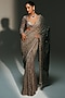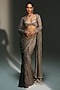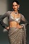 Mahima Mahajan presents a platinum pre-draped saree crafted in banarasi silk chanderi and banarasi georgette base with hand embroidery. It is paired with an embroidered blouse. Accentuate the look with chunky earring, an embellished potli bag and block heels for a perfect a wedding, sangeet or engagement ceremonies.