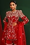 Featuring a sindoor red kurta in georgette base with embroidery. It is paired with matching embroidered gharara pants, a velvet logo belt and an embroidered dupatta having hand made tassels.