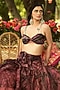 Mahima Mahajan presents a warm bubblegum pink and burgundy asymmetrical lehenga in organza base with print. It is paired with a ruched bralette and an embroidered drape. Accentuate it with statement jewellery and embellished heels, perfect for a wedding, sangeet or reception ceremony.