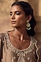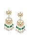 Featuring a gold finish jadau necklace studded with green stone, set in copper. It is paired with a matching pair of earrings. Perfect for weddings, festive celebrations and grand occasions.