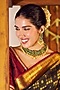 Featuring a gold finish necklace studded with kundan polki and green jadau pearl drops, set in copper. It is paired with a matching pair of earrings. Perfect wear for festive occasions or wedding ceremonies.