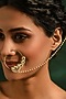 Featuring a gold finish nose ring studded with kundan polki and pearls, set in copper.