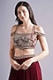 featuring a maroon gathered skirt in georgette base. It is paired with a floral embroidered net cold shoulder blouse and a choker dupatta. Accentuate it with statement jewellery and heels for a sangeet or engagement ceremony.