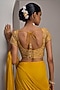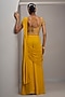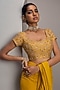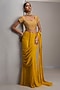 Featuring a mustard-draped saree in georgette base. It is paired with a raw silk blouse and a belt. Style with statement earrings and embellished heels for a festive occasion, haldi, wedding or sangeet ceremony.