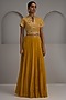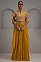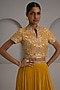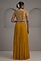 Featuring a mustard blouse in raw silk base with hand and machine embroidery. It is paired with a georgette gathered skirt and a dupatta. Style with statement jewellery and embellished heels for a haldi, wedding or sangeet ceremony.