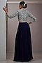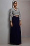 Featuring a navy crop jacket in raw silk base with hand and machine embroidery. It is paired with a georgette skirt. Style with dangler earrings and heels for a festive occasion, reception, wedding or sangeet ceremony.