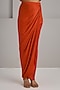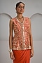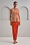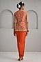 Featuring an orange jacket in raw silk base with hand and machine embroidery. It is paired with a crepe silk skirt. Style with statement earrings and embellished heels for a festive occasion, cocktail or sangeet ceremony.
