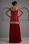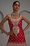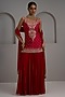 Featuring a red tunic in raw silk base with hand and machine embroidery. It is paired with georgette flared sharara pants and a dupatta. Style with statement earrings and embellished heels for a festive occasion, mehendi, wedding or sangeet ceremony.
