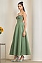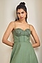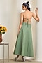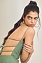 Featuring a sage green dress in cotton linen base with noodle strap and embroidery. Accentuate it with stud, a head scarf and flats, perfect for summer outings and casual daywear.