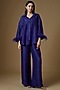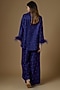 Featuring an electric blue shirt in dupion silk bae with metal embroidery and feather detail. It is paired with a matching bustier and pants.
