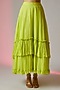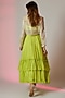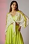 Featuring an off-white tie-up top in flat chiffon and foil georgette base with mirror embroidery. It is paired with a contrasting lime green bustier and a high-low skirt.