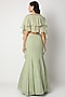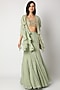 Featuring a pistachio bustier in pure georgette base with mirror embroidery. It is paired with a matching foil skirt, a cape, and a belt and neon pink tassels.