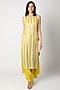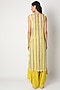 Featuring a yellow kurta in organza and silk base with criss-cross detailing and linear aari embroidery. It is paired with matching cowl pants and a bustier.