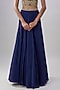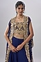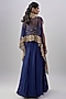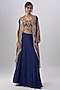 Featuring a blue cape in net base with thread, seep and cutdana embroidery. It is paired with a georgette skirt and a bustier. Accentuate it with statement earrings and metallic heels for a modern regal touch, ideal for cocktail evenings or wedding receptions.