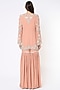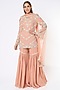 Featuring a blush pink kurta in georgette base with pearl, cutdana, and seep handwork. It is paired with matching sharara pants and a net dupatta.