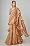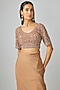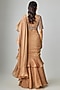 Featuring a champagne draped saree in organza base with seep, nalki and cutdana embroidery. It is paired with a net blouse. Accentuate it with statement jewellery, a clutch and nude block heels for a stylish ensemble, ideal for cocktail evenings, glamorous gala night or sangeet ceremony.