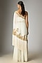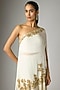 Featuring a cream cape in georgette base with thread, cutdana and seep work. It is paired with sharara and a tube top. Accentuate it with statement dangler earrings, a metallic clutch and block heels for sangeet nights, cocktail parties or any pre-wedding ceremony.