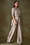 Featuring a grey cropped top in georgette base with seep and cutdana embroidery. It is paired with matching silk satin pants.