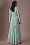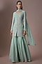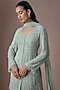 Featuring an ice blue jacket in georgette base with cutdana and pearl work. It is paired with organza sharara and a net dupatta. Accentuate it with zircon jewellery and block heels for weddings or sangeet ceremonies.