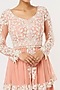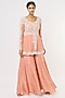 Featuring a pink peplum kurta in net base with pearl, seep and thread handwork. It is paired with matching silk satin sharara pants and an embroidered belt.
