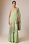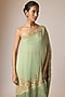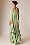 Featuring a sage green cape in georgette base with embroidery. It is paired with sharara and an inner. Style it with kundan polki earrings and block heels, perfect for mehendi ceremony or cozy family get-togethers.