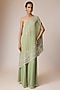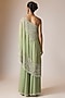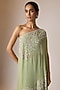 Featuring a sage green cape in georgette base with embroidery. It is paired with sharara and an inner. Style it with kundan polki earrings and block heels, perfect for mehendi ceremony or cozy family get-togethers.