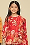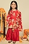 Featuring a crimson red kurta for girls in handwoven chanderi base with floral motif print. It is paired with matching sharara pants and a net butterfly dupatta. Perfect festive wear.
