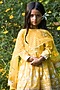 Featuring a yellow anarkali for girls in handwoven chanderi base with block print. It is paired with cotton pyjama pants and a butterfly net dupatta. Accessorize with sandals and a cute hair accessory for a haldi ceremony or festive occasion.