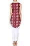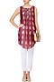 Featuring a cherry red shibori effect sleeveless top in chanderi base appliqued with thread embroidery in pear shaped motifs all over the front and back. It has button closure detailing on the front placket and an asymmetric hemline.