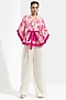 Featuring a hot pink peplum top in satin base with kimono sleeves, color blocking, and sakura floral print. It is paired with contrasting ivory pants.