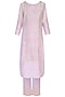 This set features a lavender straight kurta in chanderi base embedded with golden thread embroidery and gota patti work in an ornamental pattern on the front and back. It is paired with matching lavender pants.