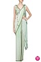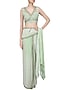 Featuring a pastel green mukaish embroidered layered saree in lucknowi georgette base. It is paired with a pastel green V neck cross over lace trimmed blouse embedded with mukaish embroidery all over along with a pastel green peticoat / underskirt.