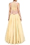 This set features a pastel yellow band collar sleeveless short flared top embellished with cutdana and resham work. It is paired with a matching pastel yellow pleated corset dress.