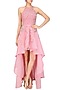 Featuring a pink halter neck high low gown in mesh neoprene with flora embroidery all over.