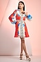 Featuring a red and blue mini dress in chiffon base with placement print and pintuck border. Accentuate it with dangler earrings and heels for a complete look.