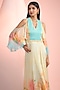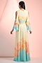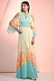 Featuring a sky blue and beige maxi dress in chiffon base with cape sleeves, print and v-neckline. Accentuate it with dangler earrings and heels for a complete look.