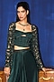 Featuring an emerald green jacket in organza and pure satin base with beads, cutdana, beads and sequins embroidery. It is paired with a blouse and a draped skirt. Accentuate it with statement earrings and sleek heels for a high-fashion edge, perfect for cocktail parties, receptions and glamorous evening events.