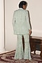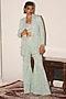 Featuring a mint green jacket in organza base with embroidery. It is paired with a crepe bustier having pearl, sequins, swarovski, resham and cutdana embroidery, including embroidered sharara pants. Accentuate it with sleek heels and minimal jewellery for a chic Indo-western vibe, perfect for cocktail parties and evening events.
