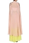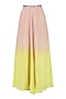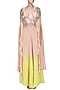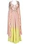 Featuring a pink bustier in crepe base embroidered using dabka, sequins, and cutdana hand work. It is paired with a pink and yellow ombre dyed palazzo in cotton silk base along with an embroidered cape finished with ruffle detailing.